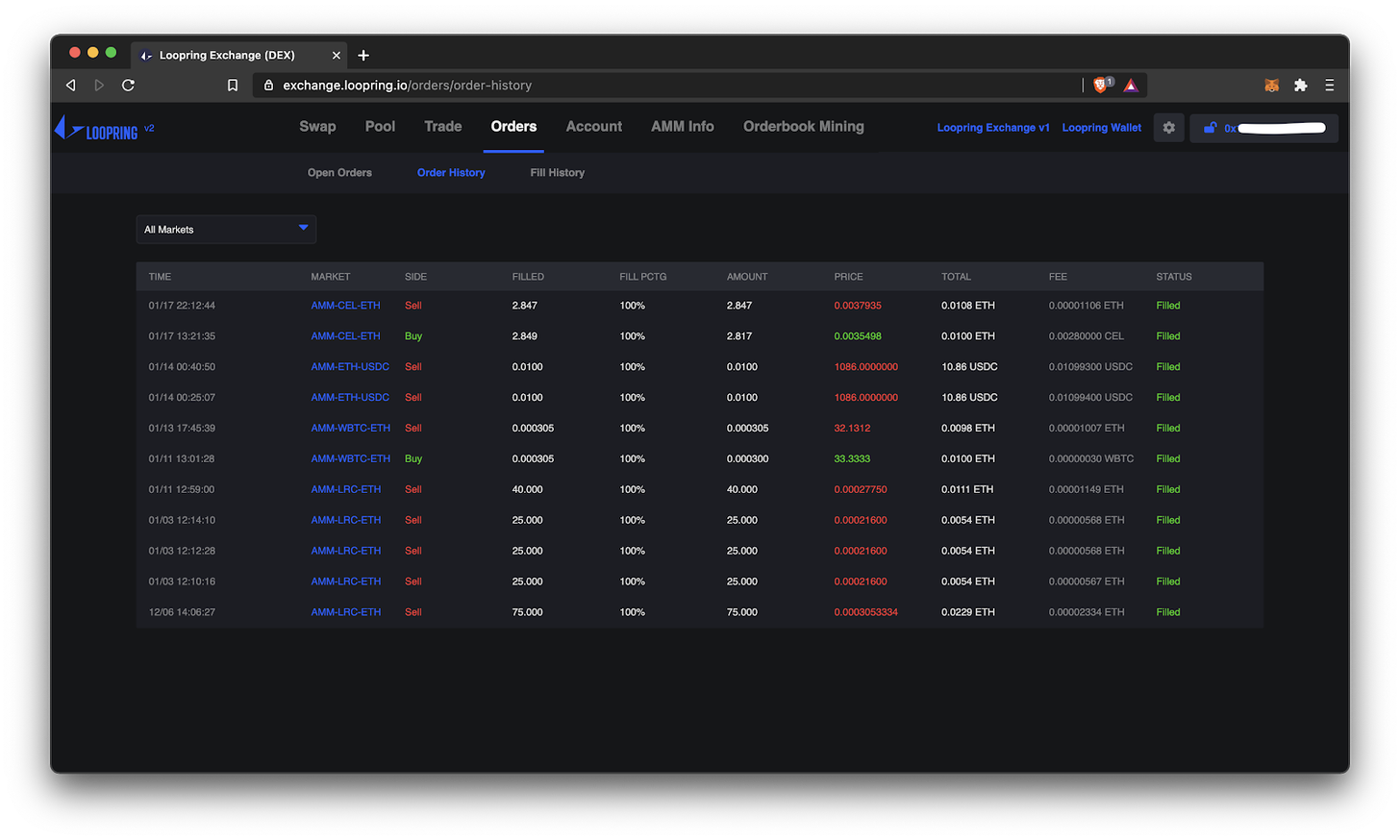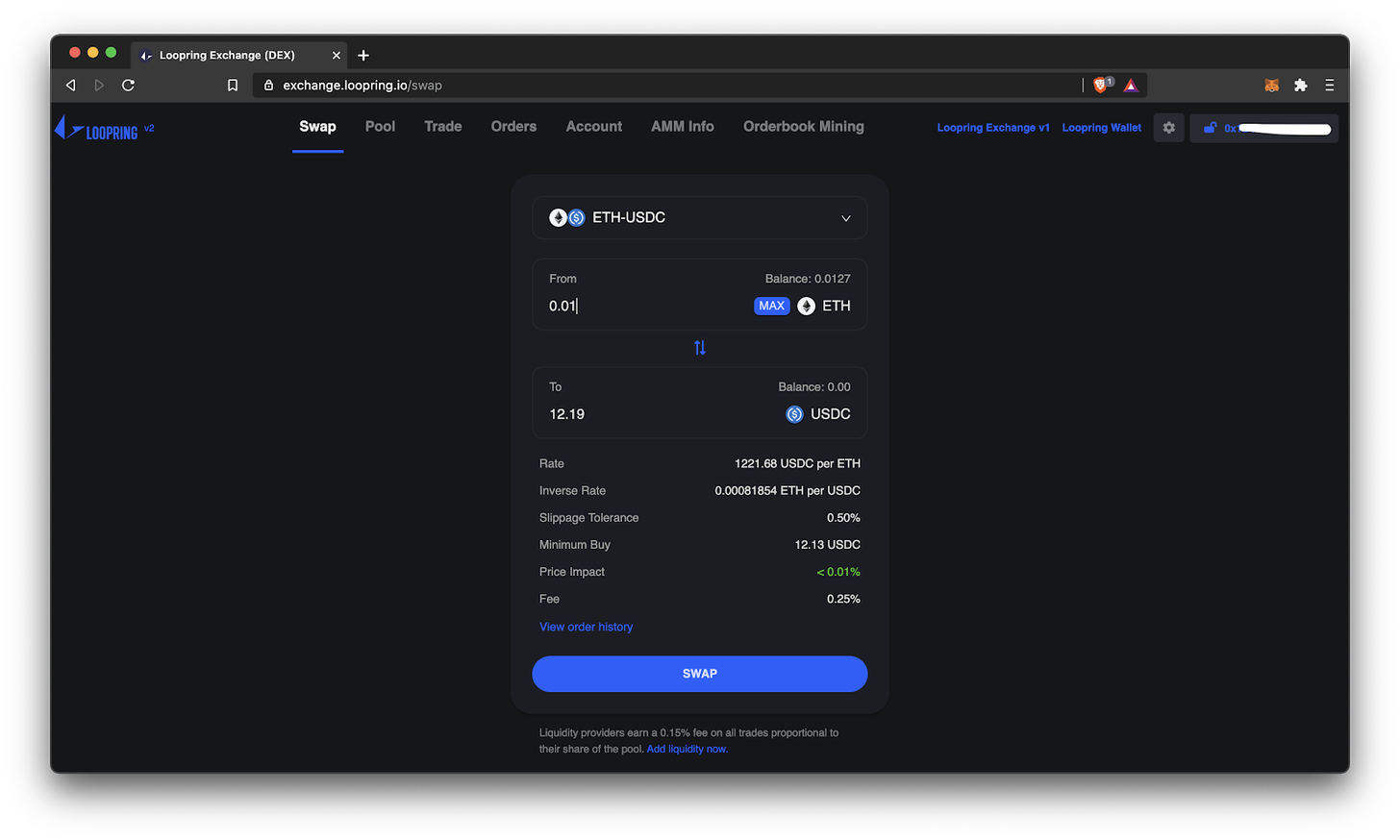 Loopring L2 supports both types of Ethereum DEX ‘market structures’: orderbooks and Automated Market Makers (AMMs). First let’s look at swapping on the AMM.