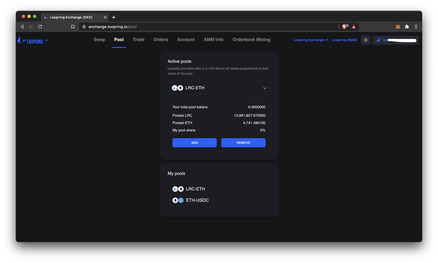 To become an LP on Loopring, head over to the ‘Pool’ tab on top, and choose which pool you want to provide liquidity to from the drop-down menu. Click ‘Add’.