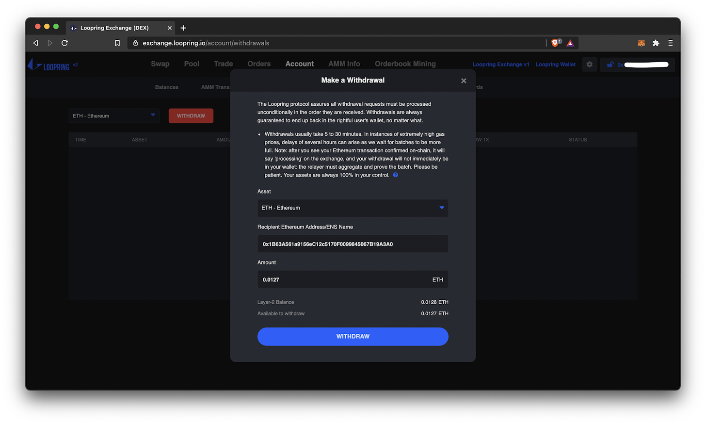 On the ‘Account’ tab, you can withdraw assets from your Loopring L2 account back to Ethereum L1. Remember, a big virtue of zkRollups is that you can withdraw at anytime — your funds can never be stolen, frozen, or seized by Loopring.