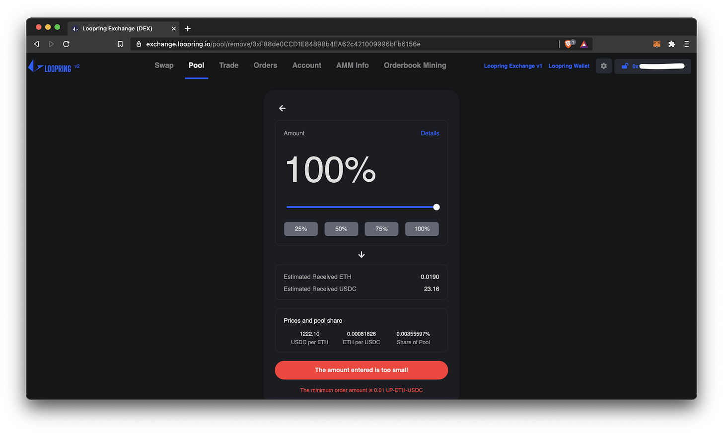 You will be prompted to decide how much of your assets you want to withdraw from that pool. Decide the amount, which effectively means redeeming your LP tokens for that portion of the underlying two tokens.