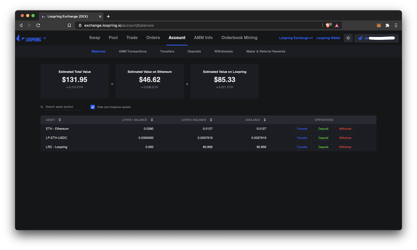 Once you’re logged in, you can check out your Loopring L2 balances, deposit other assets, or withdraw back to L1 by click on the “Account” tab.