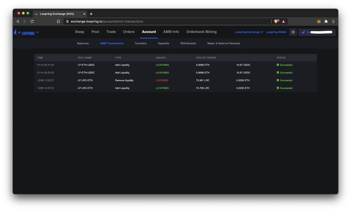 To see the history of your AMM pool add/remove liquidity operations, click ‘Account’, and then ‘AMM Transactions’.
